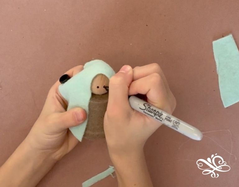 The last step is to make the baby Jesus. Start by drawing a little face on the baby Jesus with a black sharpie. Take hot glue and glue your bead to a piece of felt. Wrap the felt around the bead and you will have a little body for the baby Jesus. Cut off any extra felt. Hot glue Jesus on top of yoru manger.