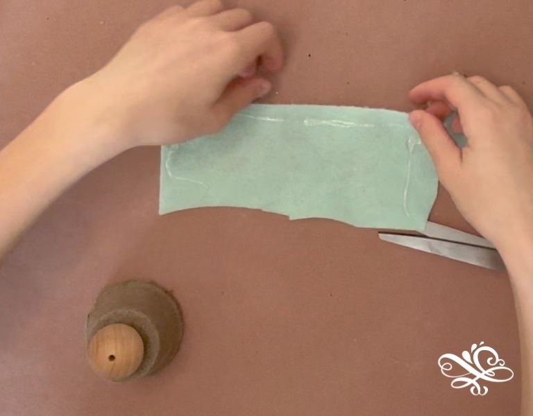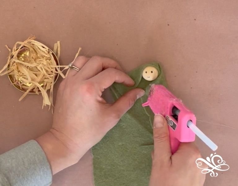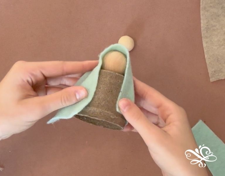 Next take your felt, with the color of your choice for Mary and Joseph. Cut out a rectangle 6-8″ in length and hot glue it over the bead. Do this for Mary and Joseph both.